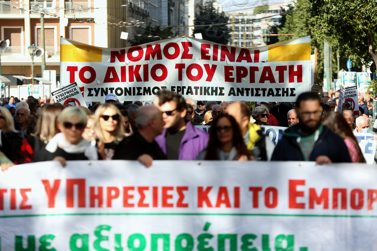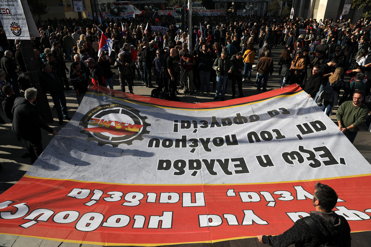 Διαδηλωτές συμμετέχουν σε συλλαλητήριο στο κέντρο της Αθήνας, στο πλαίσιο της 24ωρης γενικής απεργίας που έχουν προκηρύξει τα εργατικά συνδικάτα, Τετάρτη 20 Νοεμβρίου 2024. ΑΠΕ-ΜΠΕ/ ΑΛΕΞΑΝΔΡΟΣ ΜΠΕΛΤΕΣ