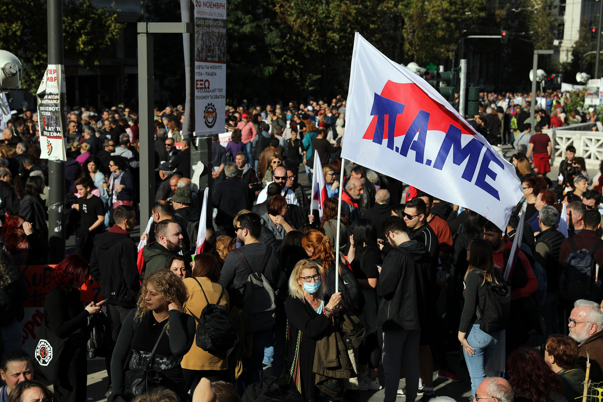 Μέλη του ΠΑΜΕ συμμετέχουν σε συγκέντρωση και πορεία διαμαρτυρίας στο κέντρο της Αθήνας, στο πλαίσιο της 24ωρης γενικής απεργίας που έχουν προκηρύξει τα εργατικά συνδικάτα, Τετάρτη 20 Νοεμβρίου 2024. ΑΠΕ-ΜΠΕ/ ΓΙΩΡΓΟΣ ΒΙΤΣΑΡΑΣ