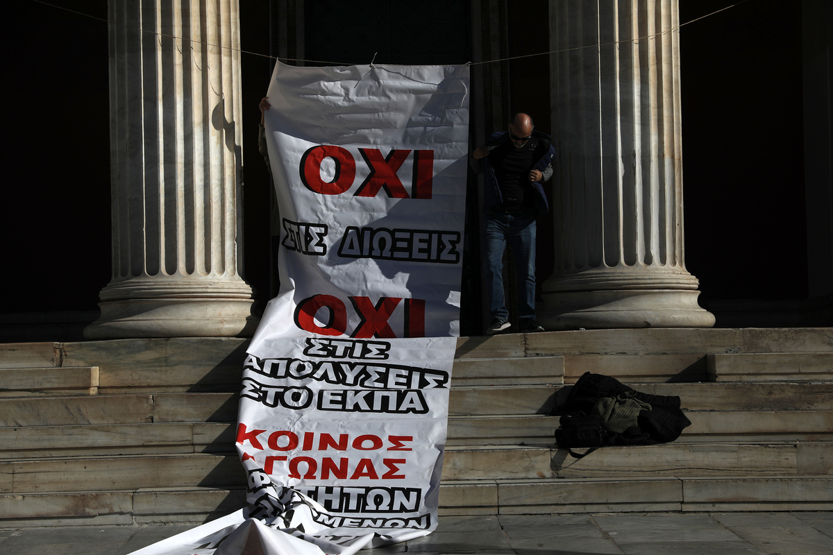 Πανό διαμαρτυρίας έχει αναρτηθεί στην πρόσοψη του ΕΚΠΑ κατά τη διάρκεια συλλαλητηρίου στο κέντρο της Αθήνας, στο πλαίσιο της 24ωρης γενικής απεργίας που έχουν προκηρύξει τα εργατικά συνδικάτα, Τετάρτη 20 Νοεμβρίου 2024. ΑΠΕ-ΜΠΕ/ ΓΙΩΡΓΟΣ ΒΙΤΣΑΡΑΣ