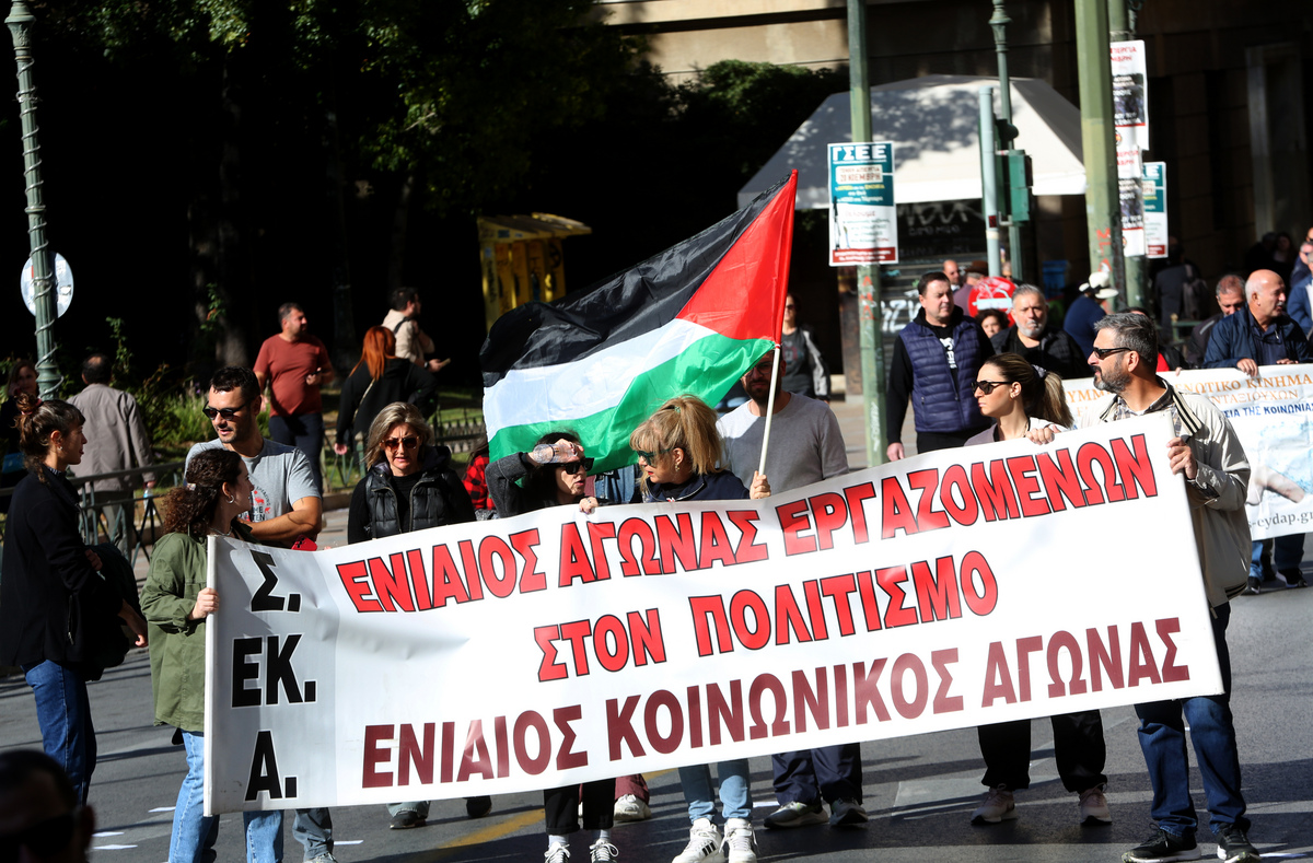 Η συγκέντρωση στα Προπύλαια άνοιξε με μήνυμα από τη Γενική Ένωση Παλαιστινίων Εργατών, με αγωνιστικούς χαιρετισμούς στα συνδικάτα της Ελλάδας.