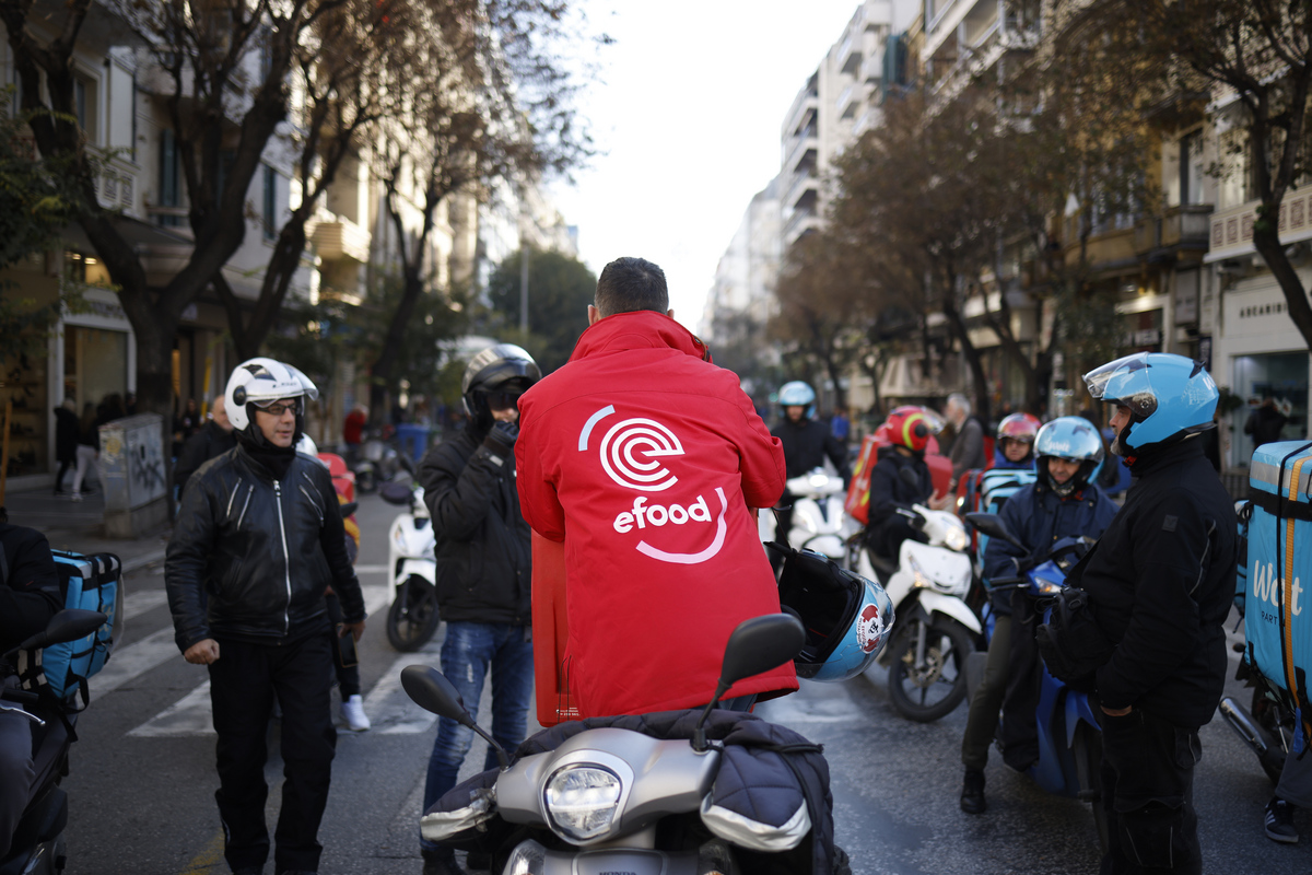 Διανομείς συμμετέχουν σε συγκέντρωση και πορεία διαμαρτυρίας στο κέντρο της Θεσσαλονίκης, στο πλαίσιο της 24ωρης γενικής απεργίας που έχουν προκηρύξει τα εργατικά συνδικάτα, Τετάρτη 20 Νοεμβρίου 2024. ΑΠΕ-ΜΠΕ/ΑΧΙΛΛΕΑΣ ΧΗΡΑΣ