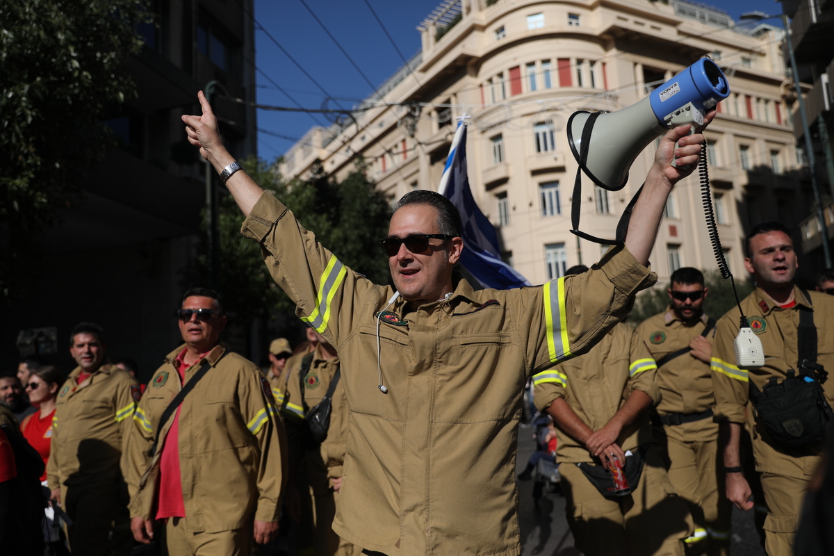 Εποχικοί πυροσβέστες συμμετέχουν σε συλλαλητήριο στο κέντρο της Αθήνας, στο πλαίσιο της 24ωρης γενικής απεργίας που έχουν προκηρύξει τα εργατικά συνδικάτα, Τετάρτη 20 Νοεμβρίου 2024. ΑΠΕ-ΜΠΕ/ ΓΙΩΡΓΟΣ ΒΙΤΣΑΡΑΣ