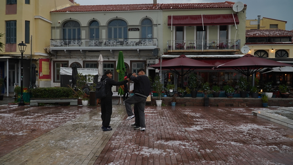 Χαλάζι στο λιμάνι της Μυτιλήνης, κατά τη διάρκεια της κακοκαιρίας Adel, Λέσβος, Παρασκευή 28 Νοεμβρίου 2025. ΑΠΕ-ΜΠΕ/ΗΛΙΑΣ ΜΑΡΚΟΥ