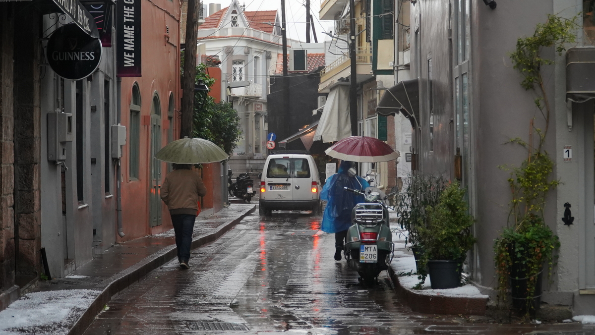 Κόσμος περπατά κρατώντας ομπρέλες, κατά τη διάρκεια της κακοκαιρίας Adel με ισχυρή χαλαζόπτωση και βροχτώσεις στη Μυτιλήνη, Λέσβος, Παρασκευή 28 Νοεμβρίου 2025. ΑΠΕ-ΜΠΕ/ΗΛΙΑΣ ΜΑΡΚΟΥ
