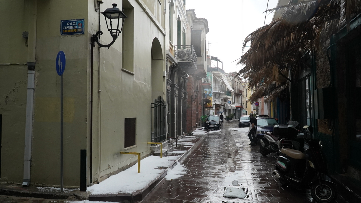 Χαλάζι πάνω στα πεζοδρόμια στο κέντρο της Μυτιλήνης, κατά τη διάρκεια της κακοκαιρίας Adel, Λέσβος, Παρασκευή 28 Νοεμβρίου 2025. ΑΠΕ-ΜΠΕ/ΗΛΙΑΣ ΜΑΡΚΟΥ