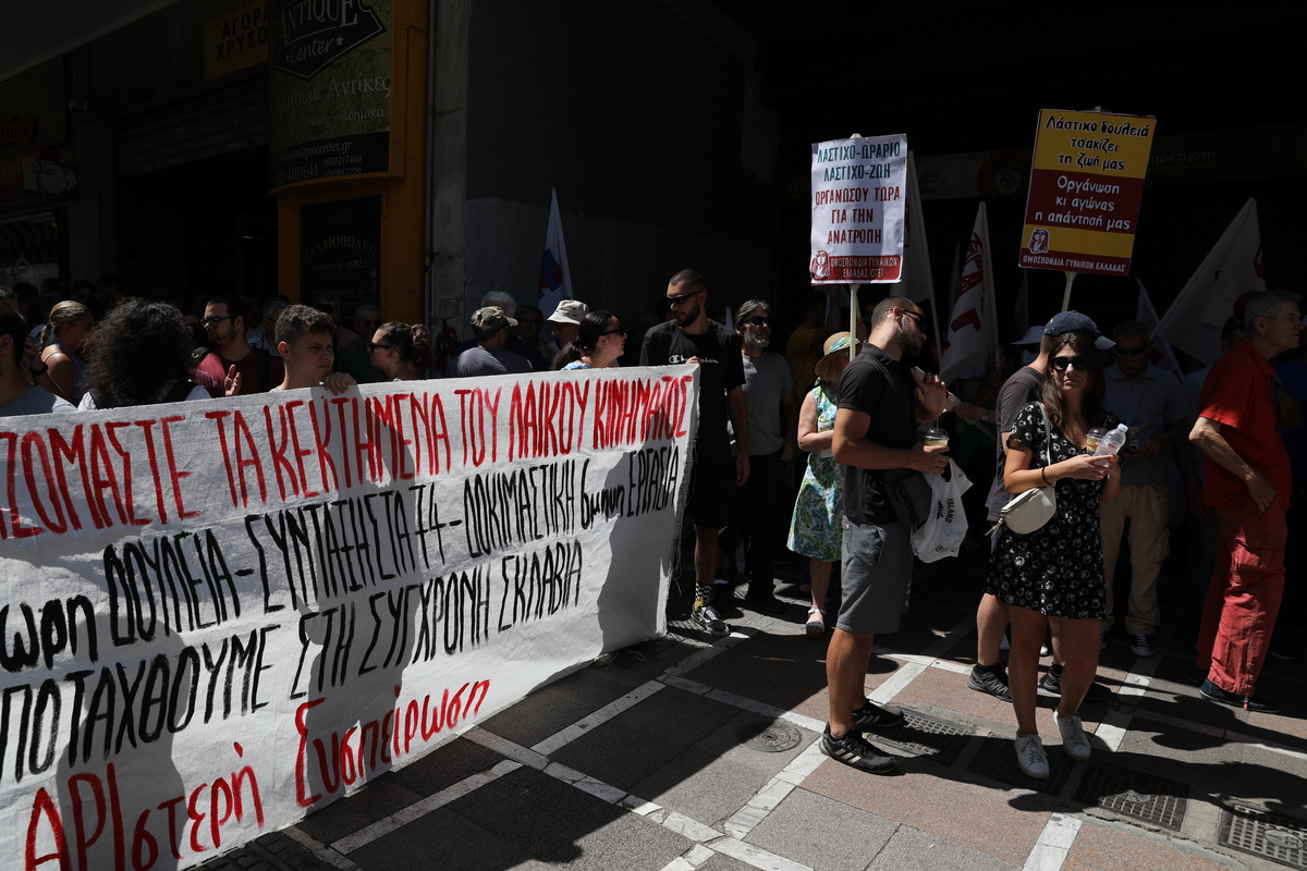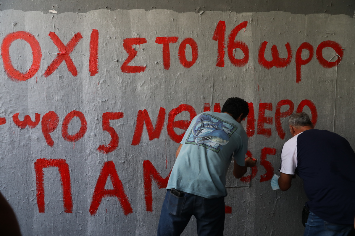 Kεντρικό σύνθημα της συγκέντρωσης ήταν «Όχι στη 16ωρη εργασία-Όχι δουλειά ώς τα 74, 35ωρο-7ωρο-πεθήμερο, γενναίες αυξήσεις».