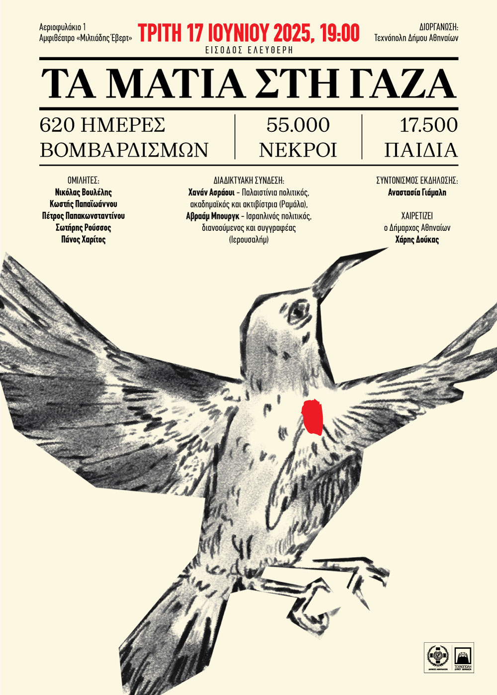 | Με αφορμή τις δραματικές εξελίξεις στη Λωρίδα της Γάζας, η Τεχνόπολη Δήμου Αθηναίων διοργανώνει την Τρίτη 17 Ιουνίου στις 19:00 τη δημόσια εκδήλωση με τίτλο «Τα μάτια στη Γάζα», στο Αεριοφυλάκιο 1 – Αμφιθέατρο «Μιλτιάδης Έβερτ». 620 ημέρες μετά την επιβολή του καθολικού αποκλεισμού στην περιοχή από το Ισραήλ, η ανθρωπιστική κρίση στη Γάζα εξακολουθεί να βαθαίνει. Με τις απώλειες των αμάχων να πολλαπλασιάζονται, τις διόδους για ανθρωπιστική βοήθεια να παραμένουν κλειστές και τις κινήσεις αλληλεγγύης από το εξωτερικό να αποκρούονται συστηματικά, η ανάγκη για ενημέρωση, ευαισθητοποίηση και δημόσια συζήτηση είναι πιο επιτακτική από ποτέ. Στην ανοιχτή εκδήλωση «Τα μάτια στη Γάζα», πολιτικοί, δημοσιογράφοι και ακαδημαϊκοί από την Παλαιστίνη, το Ισραήλ και την Ελλάδα ενώνουν τις φωνές τους ενισχύοντας τη συλλογική αντίληψη για όσα διακυβεύονται στην περιοχή της Γάζας, ο λαός της οποίας συνεχίζει να βρίσκεται στο επίκεντρο μιας από τις σοβαρότερες ανθρωπιστικές κρίσεις των τελευταίων δεκαετιών. Την εκδήλωση θα χαιρετίσει ο Δήμαρχος Αθηναίων, Χάρης Δούκας, ενώ θα συνδεθούν ζωντανά η Παλαιστίνια πολιτικός, ακαδημαϊκός και ακτιβίστρια Χανάν Ασράουι (Hanan Ashrawi) και ο Ισραηλινός πολιτικός, διανοούμενος και συγγραφέας Αβραάμ Μπουργκ (Avraham Burg). Συμμετέχουν, επίσης, οι: Νικόλας Βουλέλης, δημοσιογράφος, Κωστής Παπαϊωάννου, πρόεδρος Τεχνόπολης Δήμου Αθηναίων, Πέτρος Παπακωνσταντίνου, δημοσιογράφος, Σωτήρης Ρούσσος, καθηγητής Διεθνών Σχέσεων (Πανεπιστήμιο Πελοποννήσου) και Πάνος Χαρίτος, δημοσιογράφος, σε συντονισμό της δημοσιογράφου Αναστασίας Γιάμαλη. Η εκδήλωση θα μεταδοθεί ζωντανά από τον ραδιοφωνικό σταθμό Αθήνα 9.84 και μέσω live streaming από το YouTube κανάλι της Τεχνόπολης Δήμου Αθηναίων και την επίσημη σελίδα της στο Facebook. Πληροφορίες «Τα μάτια στη Γάζα» | Τρίτη 17.06.2025, 19:00 Τεχνόπολη Δήμου Αθηναίων, Αεριοφυλάκιο 1 – Αμφιθέατρο «Μιλτιάδης Έβερτ» Είσοδος ελεύθερη. Θα τηρηθεί σειρά προτεραιότητας |