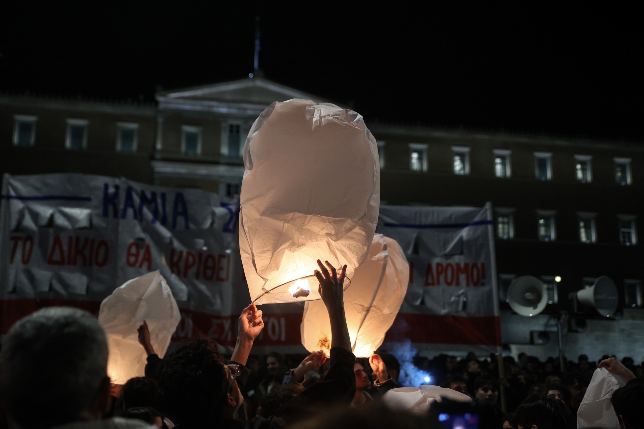 Στον Νέο Σιδηροδρομικό Σταθμό, διαδηλωτές άφησαν συμβολικά στον ουρανό λευκά μπαλονάκια με αναμμένα καντηλάκια στη βάση τους, στη μνήμη των θυμάτων του πολύνεκρου δυστυχήματος.