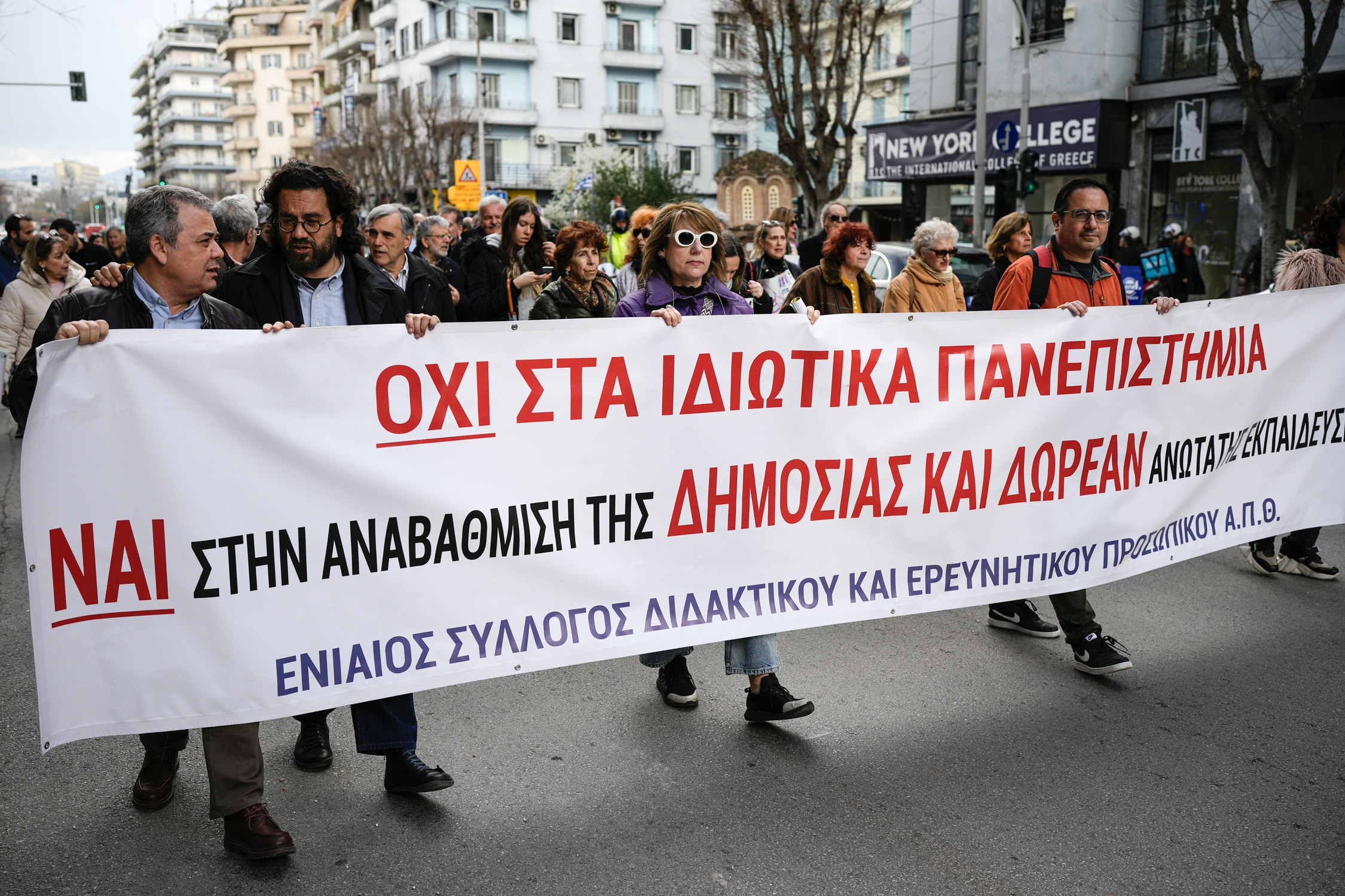Πορεία στους κεντρικούς δρόμους της πόλης πραγματοποίησαν φοιτητικοί σύλλογοι του ΑΠΘ, στο πλαίσιο κινητοποιήσεων ενάντια στο νομοσχέδιο του υπουργείου Παιδείας που προβλέπει -μεταξύ άλλων- την ίδρυση «μη κρατικών μη κερδοσκοπικών πανεπιστημίων».