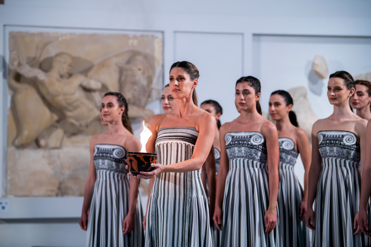 Η ηθοποιός Μαίρη Μηνά στον ρόλο της Πρωθιέρειας ανάβει τη δάδα με την Ολυμπιακή Φλόγα κατά τη διάρκεια της Τελετής Αφής της Ολυμπιακής Φλόγας των XXV Χειμερινών Ολυμπιακών Αγώνων «Μιλάνο Κορτίνα 2026», στο Αρχαιολογικό Μουσείο της Αρχαίας Ολυμπίας, Τετάρτη 26 Νοεμβρίου 2025. ΑΠΕ-ΜΠΕ/Eurokinissi Sports/POOL/ΓΙΑΝΝΗΣ ΣΠΥΡΟΥΝΗΣ