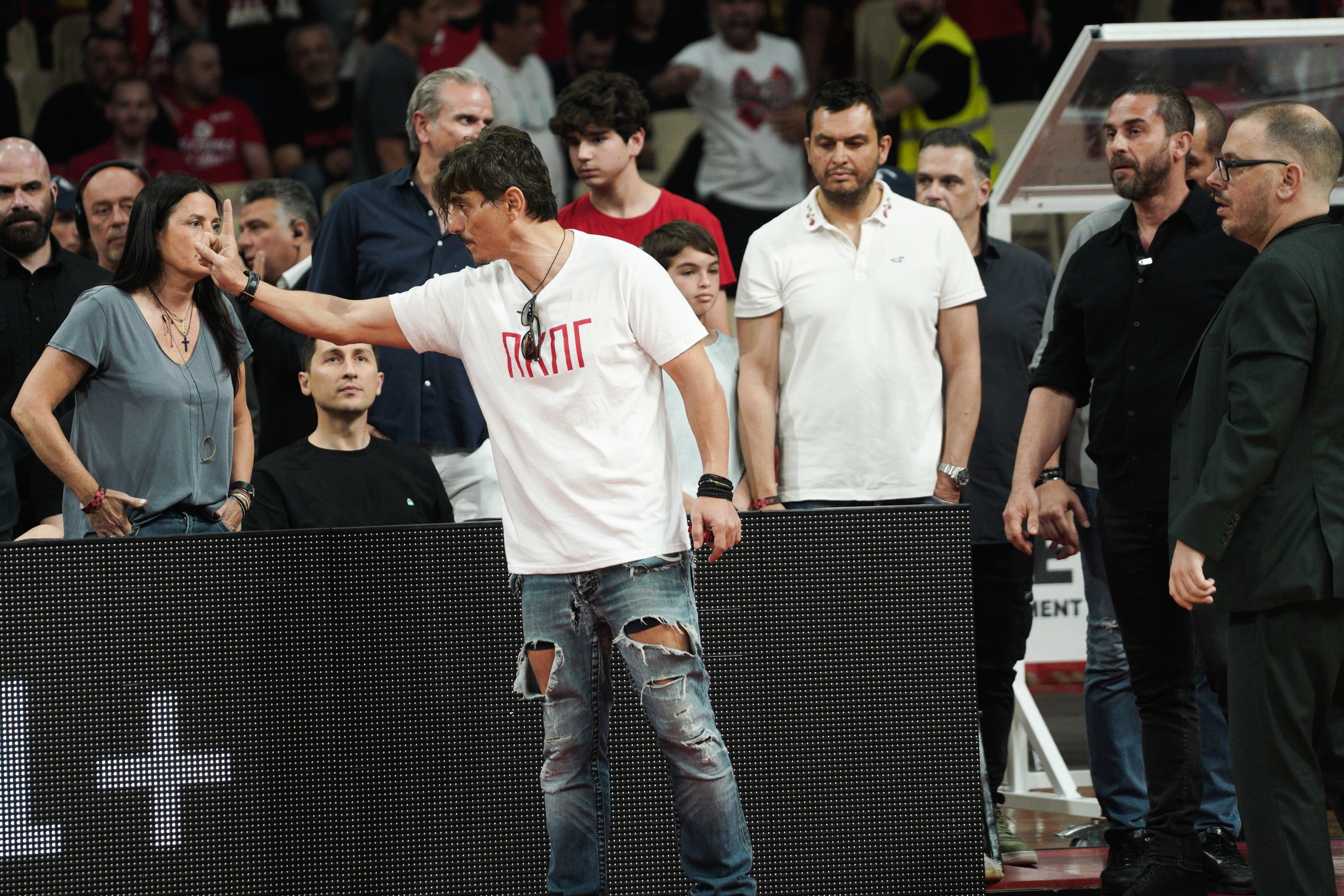 Ο Δημήτρης Γιαννακόπουλος, ο οποίος φορούσε μπλούζα με τ’ αρχικά «Π.Κ.Π.Γ» που παραπέμπει σε γνωστό σύνθημα των φιλάθλων του Ολυμπιακού, πριν το τζάμπολ, μετέβη από το παρκέ στη φυσούνα και στον χώρο των αποδυτηρίων δεν επέστρεψε στη θέση του, πίσω από την μπασκέτα και δίπλα στον πάγκο του Παναθηναϊκού.