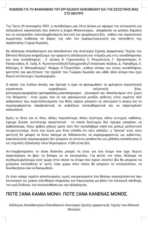 «Την Τρίτη 26 Ιανουαρίου 2021, η συνάδελφος μας Ζέτα Δούκα με αφορμή την καταγγελία για σεξουαλική κακοποίηση που υπέστη η Σοφία Μπεκατώρου αποφάσισε να μιλήσει δημόσια και να καταγγείλει επαναλαμβανόμενη λεκτική και ψυχολογική βία, καθώς και περιστατικό σωματική επίθεσης σε βάρος της από τον συμπρωταγωνιστή και σκηνοθέτη της παράστασης Γιώργο Κιμούλη. Ως σύλλογος σπουδαστριών και σπουδαστών της Ανώτερης Σχολής Δραματικής Τέχνης του Εθνικού Θεάτρου εκφράζουμε την αμέριστη αλληλεγγύη και στήριξη μας στις συναδέλφισσες και συναδέλφους: Ζ. Δούκα, Κ. Γερονικολού, Ε. Ρουμελιώτη, Γ. Χρυστοστόμου, Κ. Παπουτσάκη, Φ. Ξυλά, Α. Κωνσταντινίδη, Μ. Πολυχρονίδη, Π. Αναστασοπούλου, Δ. Παπαδήμα, Ε. Μιλιάρη,Α. Μπουρδούμη, Γ. Νιάρρο και Χ. Τζωρτζάκη, καθώς επίσης και στους συναδέλφους φοιτητές και φοιτήτριες της σχολής του Γιώργου Κιμούλη και κάθε άλλο άτομο που έχει δεχτεί αντίστοιχες συμπεριφορές.
