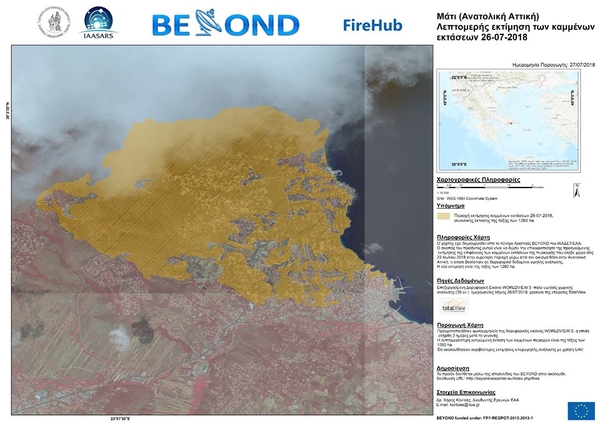 Το Κέντρο Διαχείρισης Φυσικών Καταστροφών BEYONDτου Ινστιτούτου Αστρονομίας, Αστροφυσικής, Διαστημικών Εφαρμογών & Τηλεπισκόπησης (ΙΑΑΔΕΤ) του Εθνικού Αστεροσκοπείου Αθηνών (ΕΑΑ) συνεχίζει τη χαρτογράφηση των καμένων εκτάσεων στην ευρύτερη περιοχή γύρω από τον οικισμό Μάτι, χρησιμοποιώντας συστήματα Drones/UAV υπερυψηλής χωρικής ανάλυσης, προκειμένου να παρέχει πολύ λεπτομερείς χάρτες αποτίμησης της ζημιάς σε επίπεδο ακόμη και μεμονωμένης ιδιοκτησίας.