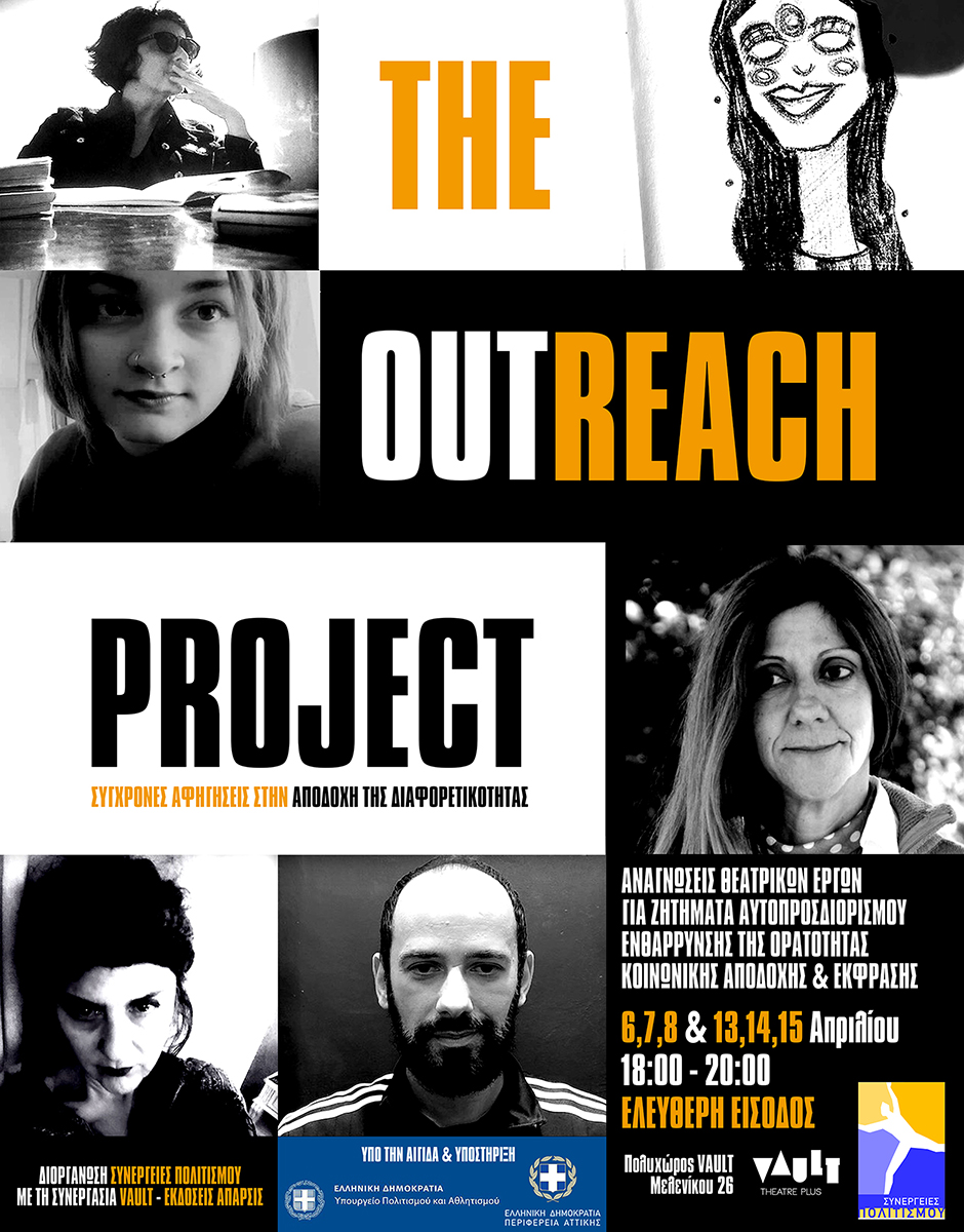 Οι Συνέργειες Πολιτισμού και ο Πολυχώρος VAULT παρουσιάζουν στις 6, 7, 8 και 13, 14, 15 Απριλίου 2022 το “OUTREACH PROJECT”, μια μοναδική πρωτοβουλία που προάγει το νεοελληνικό θεατρικό έργο και αναδεικνύει καίρια ζητήματα αυτοπροσδιορισμού και ενθάρρυνσης της ορατότητας και της κοινωνικής αποδοχής.