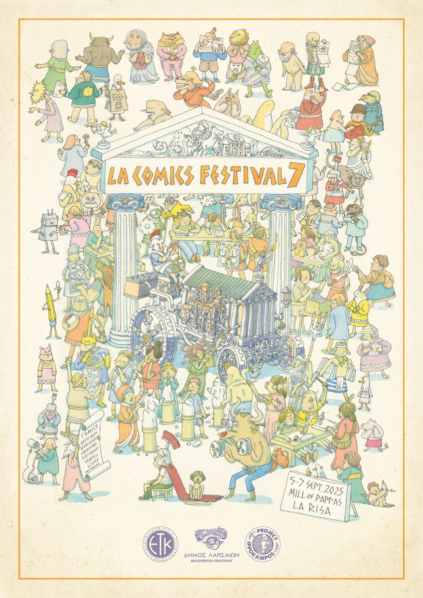 Το LAComicsFestival επιστρέφει για 7η συνεχή χρονιά, μετατρέποντας τη Λάρισα σε σημείο συνάντησης της σύγχρονης underground εικονογραφικής -και όχι μόνο- δημιουργίας! Από τις 5 έως τις 7 Σεπτεμβρίου, ο Μύλος του Παππά θα φιλοξενήσει ένα τριήμερο αφιερωμένο στις τέχνες των comics, της εικονογράφησης, τη μεταξοτυπίας, του animation, της μουσικής και της street art, πάντα με ελεύθερη είσοδο σε όλες τις δράσεις του. Το επίσημο εικαστικό σχεδίασε ο καλεσμένος του Φεστιβάλ, Σουηδός εικονογράφος Mattias Adolfsson.