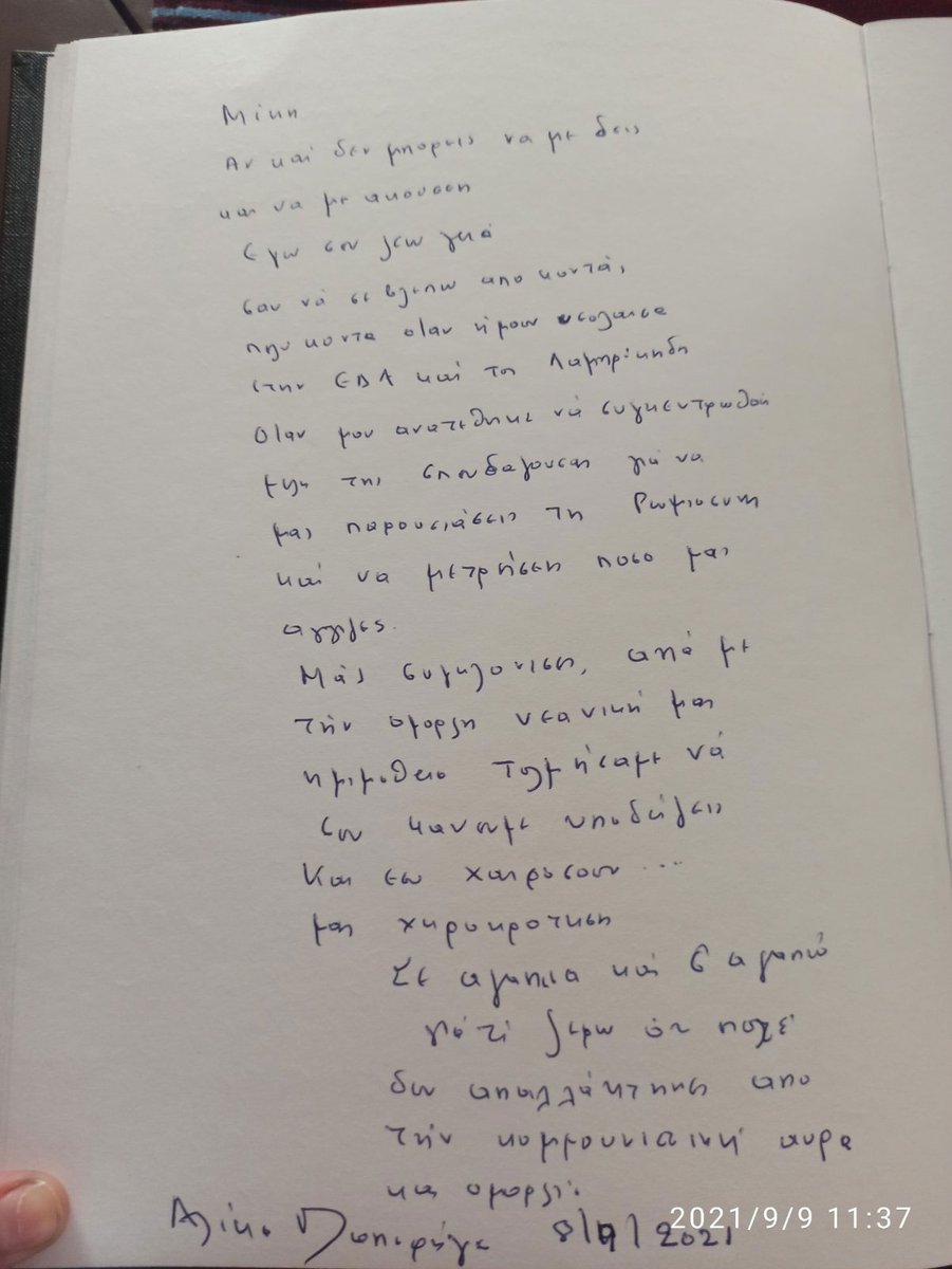 «Μίκη, αν και δεν μπορείς να με δεις και να με ακούσεις, εγώ σου λέω γεια, σαν να σε βλέπω από κοντά, πολύ κοντά όταν ήμουν νεολαίισσα στην ΕΔΑ και τους Λαμπράκηδες. Όταν μου ανατέθηκε να συγκεντρωθούν μέλη της Σπουδάζουσας για να μας παρουσιάσεις τη “Ρωμιοσύνη” και να μετρήσεις πόσο μας άγγιζες. Μας συγκλόνισες, αλλά με την όμορφη νεανική μας ημιμάθεια τολμήσαμε να σου κάνουμε υποδείξεις κι εσύ χαιρόσουν… μας χειροκρότησες.