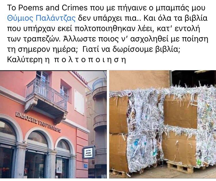 «Με μεγάλη λύπη και μικρή έκπληξη πληροφορήθηκα την καταστροφή των βιβλίων που βρέθηκαν στις αποθήκες των εκδόσεων Γαβριηλίδης. Κατασχέθηκαν και πολτοποιήθηκαν από τις πιστώτριες τράπεζες του εκδοτικού οίκου, χωρίς να υπάρξει η παραμικρή ανακοίνωση για όποιον από τους συγγραφείς επιθυμούσε με το αζημίωτο να διασώσει έστω ελάχιστα αντίτυπα – παρά τις απόπειρες από πολλούς να ενημερωθούμε. Είναι μια ενέργεια που αρμόζει σε μια φθίνουσα εποχή. Όπως φαίνεται για ορισμένους τα βιβλία δεν αξίζουν ούτε την ίδια τους την τιμή. Όπως θα έλεγε και ο Βαρβέρης: