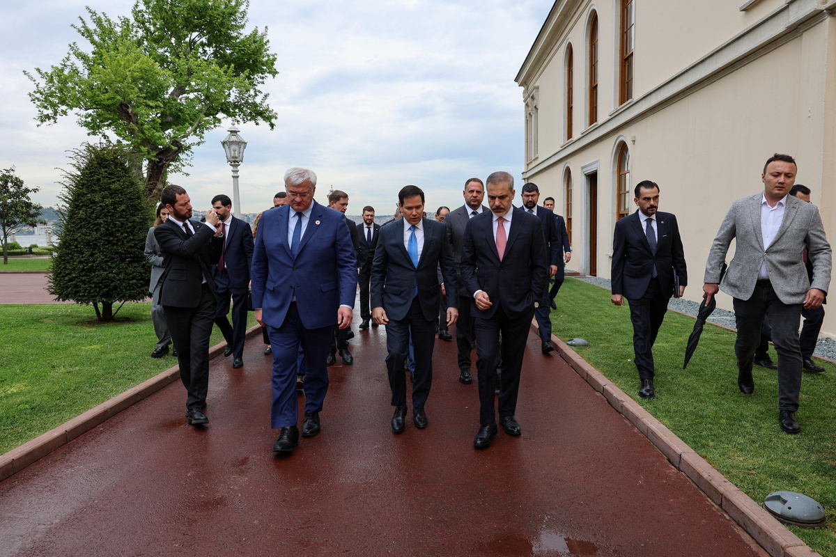 Ο υπουργός Εξωτερικών των ΗΠΑ, Μάρκο Ρούμπιο, ο Τούρκος υπουργός Εξωτερικών, Χακάν Φιντάν, ο Ουκρανός υπουργός Εξωτερικών, Αντρίι Σιμπιχά και μέλη της ουκρανικής αντιπροσωπείας να φτάνουν στο Προεδρικό Γραφείο στην Κωνσταντινούπολη, Τουρκία, 16 Μαΐου 2025. EPA/HANDOUT/TURKISH FOREIGN MINISTER PRESS OFFICE