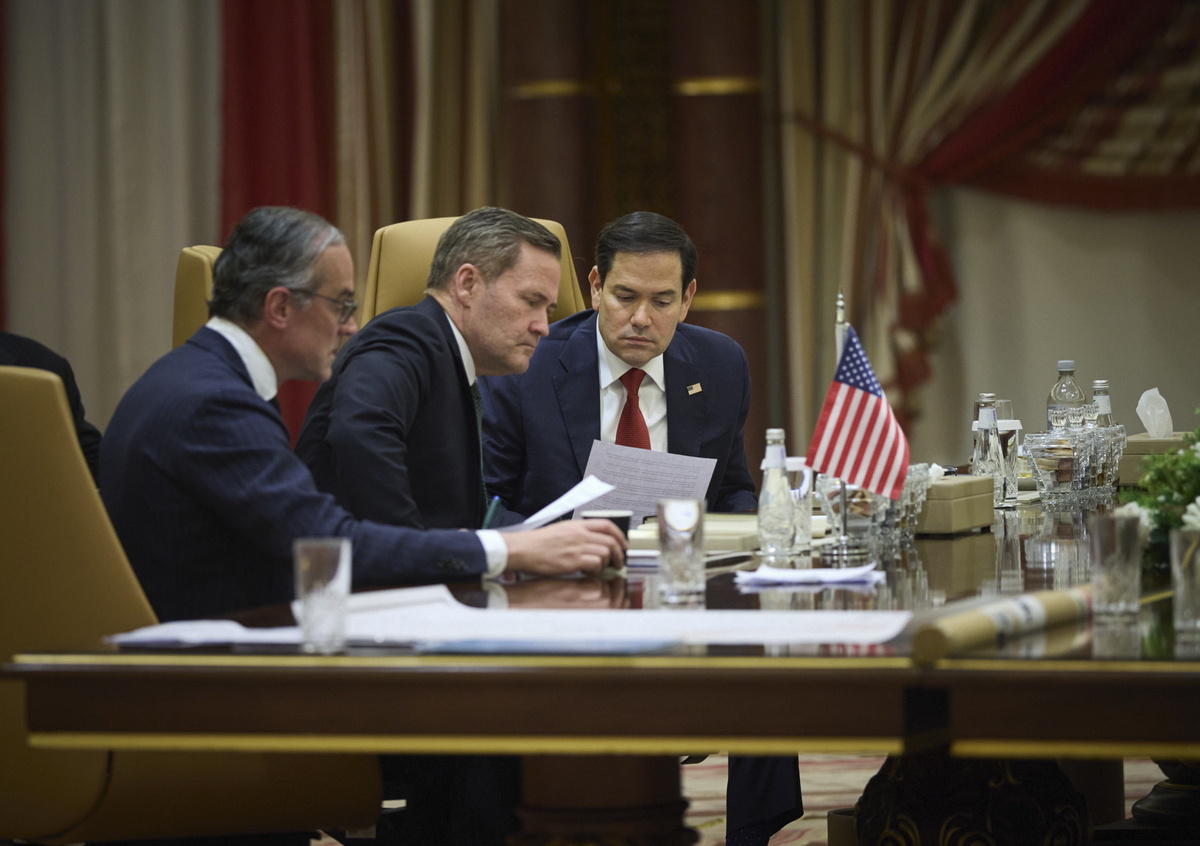 epa11957155 A handout photo made available by the Ukrainian Presidential Press Service shows US National Security Advisor Mike Waltz (C) and US Secretary of State Marco Rubio (R) during a meeting with Ukrainian officials in Jeddah, Saudi Arabia, 11 March 2025. US and Ukrainian officials are meeting in Saudi Arabia to discuss a path towards restoring peace in Ukraine. EPA/UKRAINIAN PRESIDENTIAL PRESS SERVICE HANDOUT -- MANDATORY CREDIT: UKRAINIAN PRESIDENTIAL PRESS SERVICE -- HANDOUT EDITORIAL USE ONLY/NO SALES