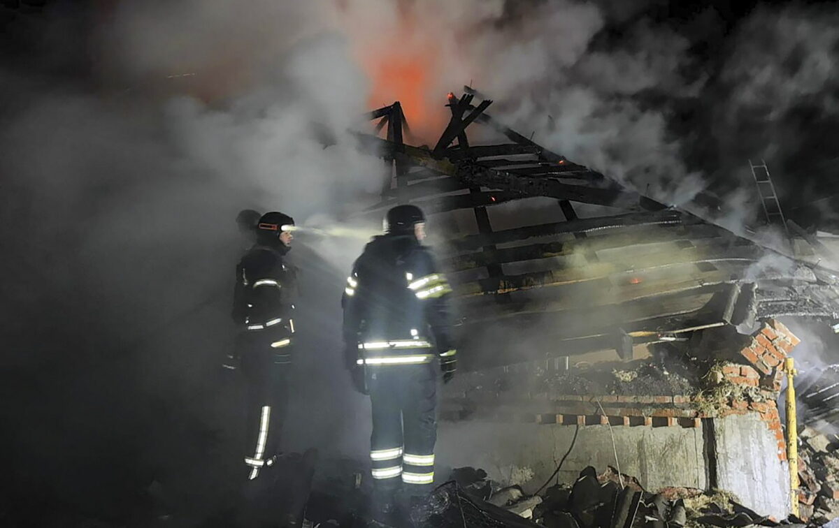 Φωτογραφίες που αναρτήθηκαν στο Telegram από την ουκρανική υπηρεσία έκτακτης ανάγκης δείχνουν πυροσβέστες να επιχειρούν να κατασβήσουν πυρκαγιά σε ένα σπίτι, με τον καπνό να υψώνεται από τα ξύλινα δοκάρια της οροφής.