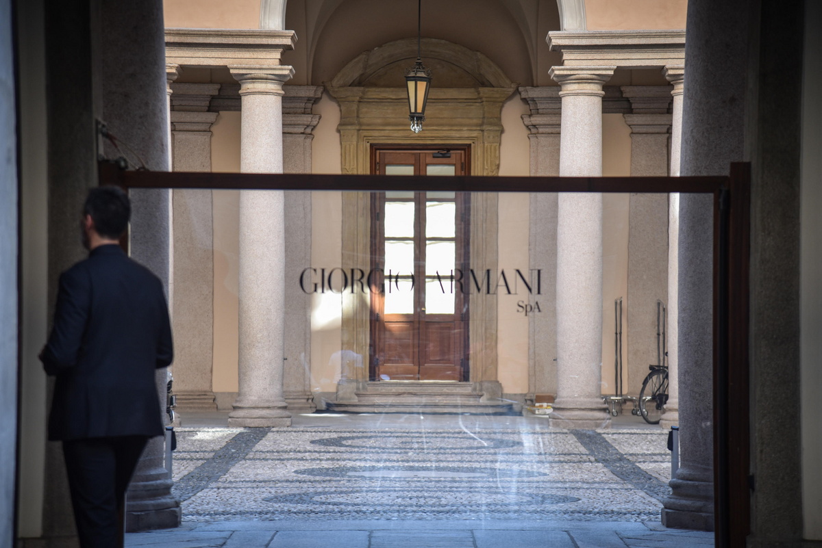 epa12352012 A person at the entrance to the Giorgio Armani headquarters in Milan, Italy, 04 September 2025. Italian fashion designer Giorgio Armani died aged 91, his company confirmed on 04 September 2025. EPA/MATTEO CORNER