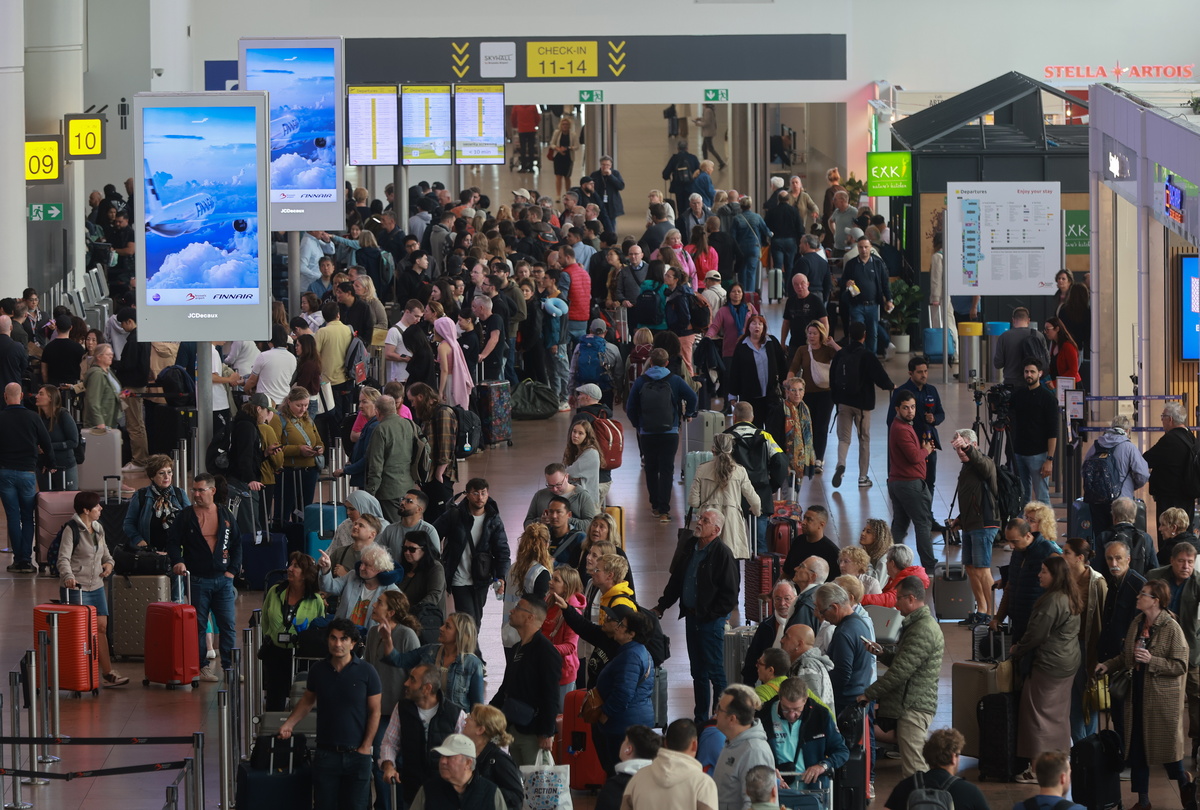epa12395019 Passengers queue in line at Brussels airport where dozens of flights were canceled following a cyberattack affecting multiple airports in Europe, 21 September 2025. Several European airports were hit by a cyberattack on 20 September which affected electronic check-in and baggage systems, causing delays and cancellations of flights. EPA/OLIVIER HOSLET