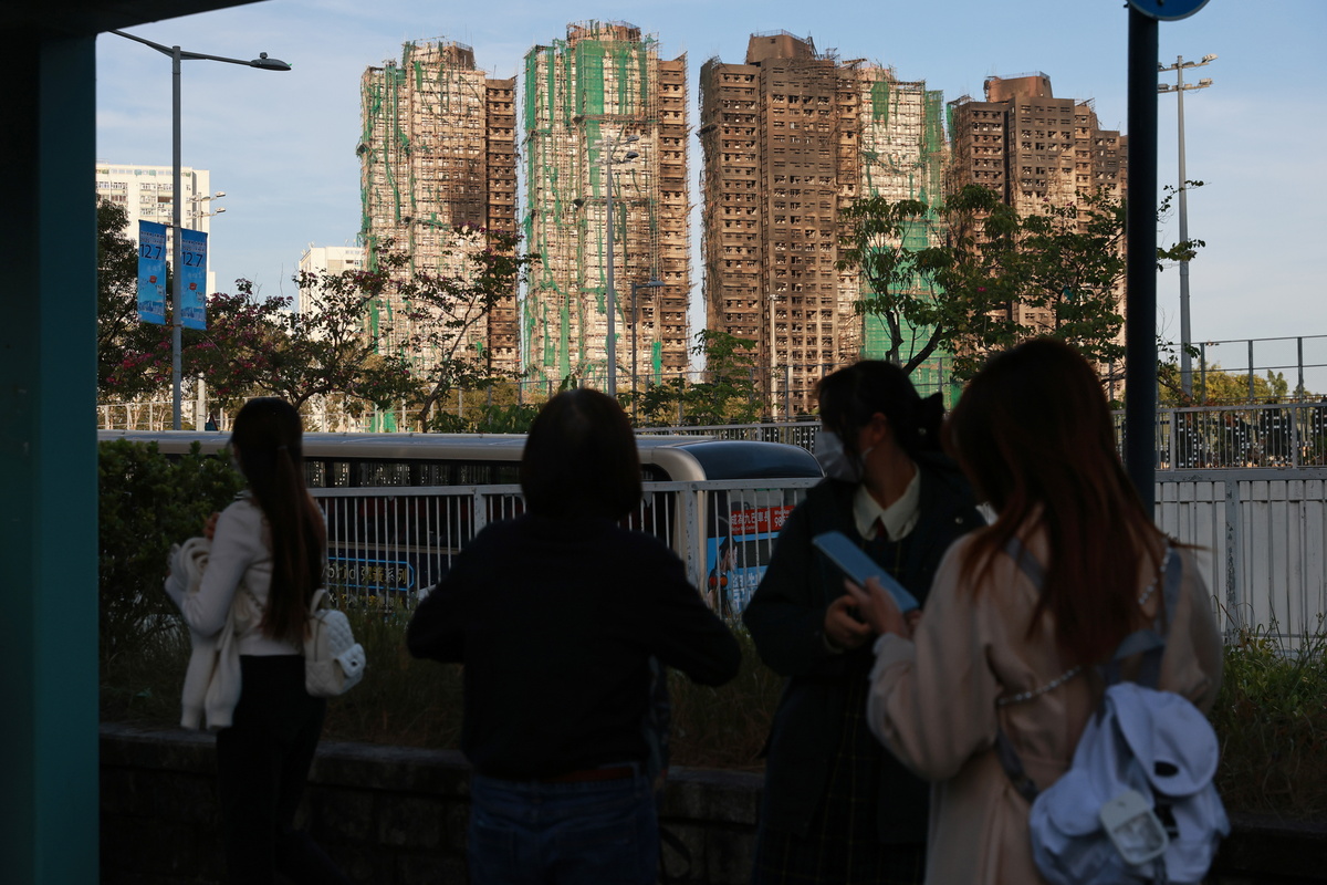 epa12554513 People look on Tai Po apartment complex in Hong Kong, China, 28 November 2025. The Tai Po apartment complex fire, which began on 26 November, has killed at least 128 people and left hundreds missing. EPA/MAY JAMES