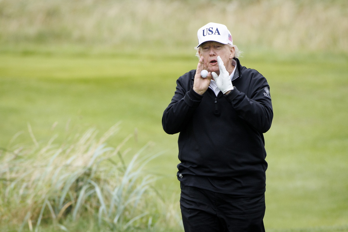 epaselect epa12265585 US President Donald J. Trump speaks to the media while playing golf at Trump Turnberry golf course during a private visit in Turnberry, Scotland, Britain, 27 July 2025. US President Trump is in Scotland where he will visit his golf courses and meet with UK Prime Minister Keir Starmer. EPA/TOLGA AKMEN