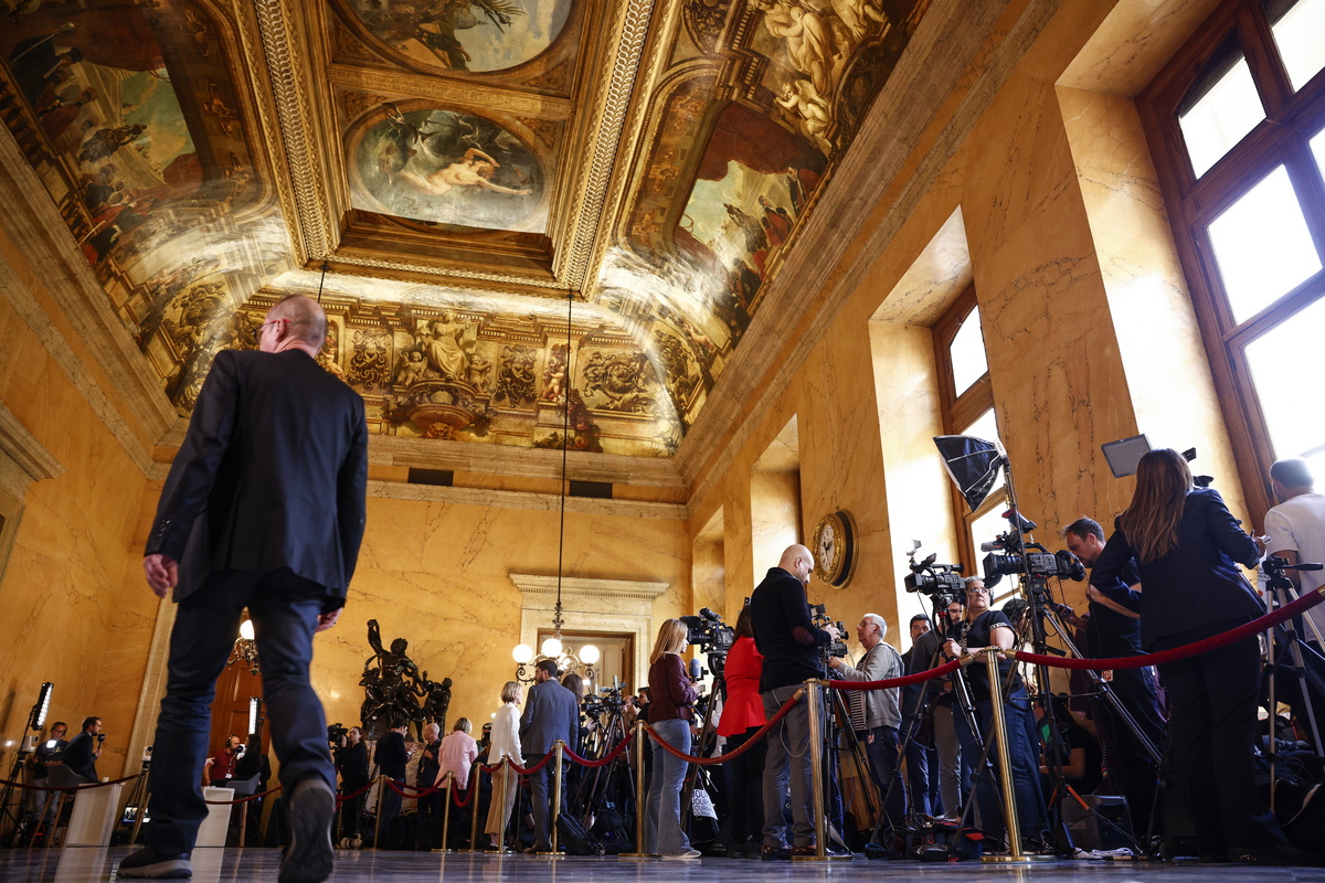 epa12362245 Journalists stand at the French National Assembly as the French prime minister and his government face a vote of confidence, in Paris, France, 08 September 2025. The confidence vote comes after the French prime minister activated Article 49.1 of the Constitution. EPA/YOAN VALAT