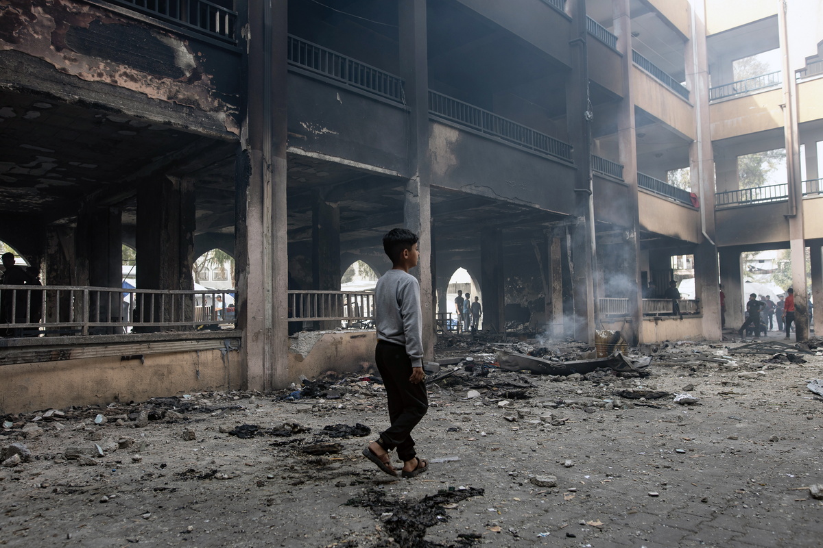 Εκτοπισμένοι Παλαιστίνιοι επιθεωρούν τις ζημιές στο Σχολείο Yaffa μετά από ισραηλινή αεροπορική επιδρομή, ανατολικά της πόλης της Γάζας, 23 Απριλίου 2025. EPA/HAITHAM IMAD