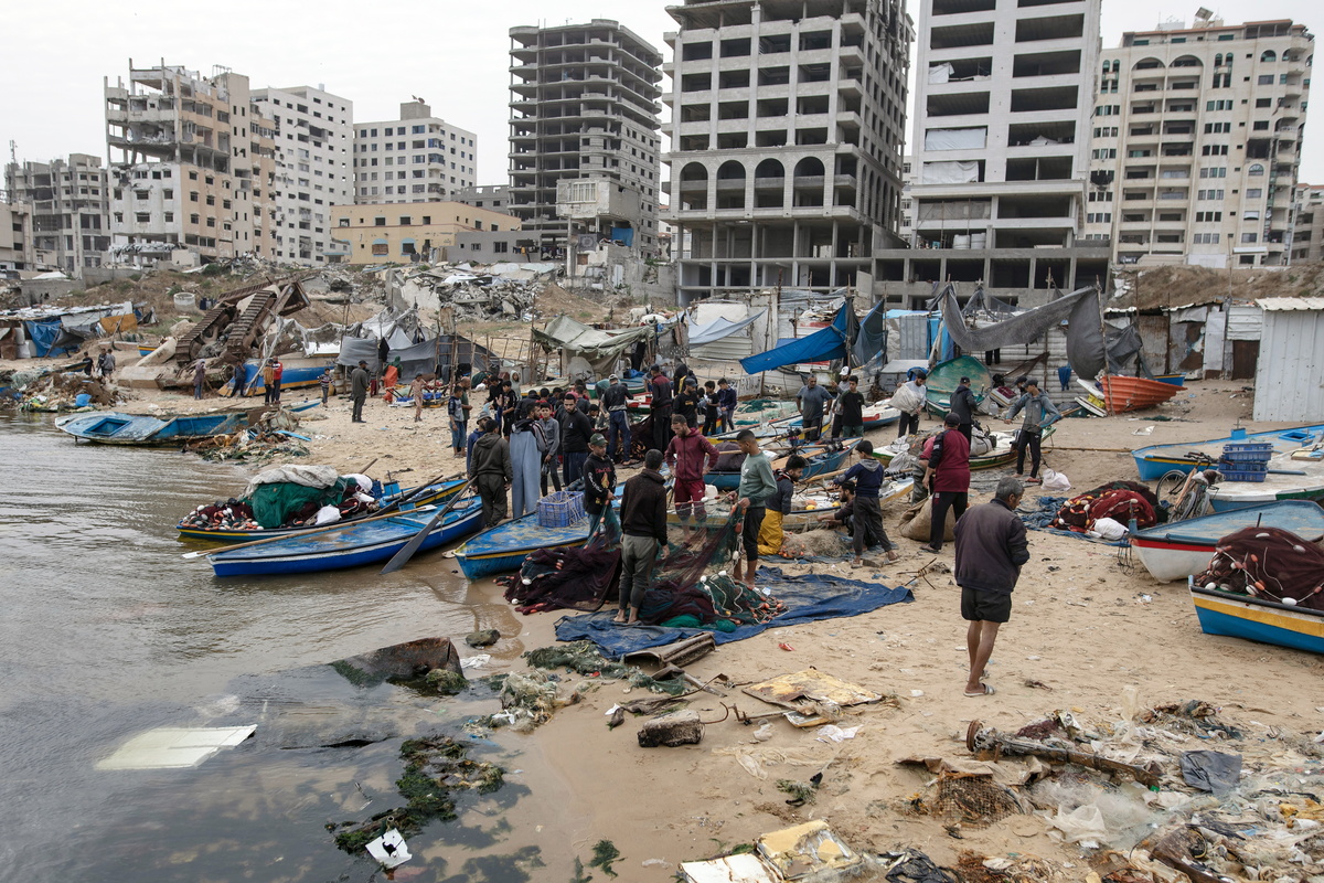Παλαιστίνιοι ψαράδες μαζεύουν τα δίχτυα τους στην ακτή στη Γάζα, 12 Μαΐου 2025. Οι Παλαιστίνιοι συνεχίζουν να ψαρεύουν παρά το κλείσιμο των συνόρων και την περιορισμένη προσφορά που επηρεάζει τη διαθεσιμότητα, καθιστώντας τα ψάρια ένα ακριβό αγαθό στη Γάζα. EPA/HAITHAM IMAD