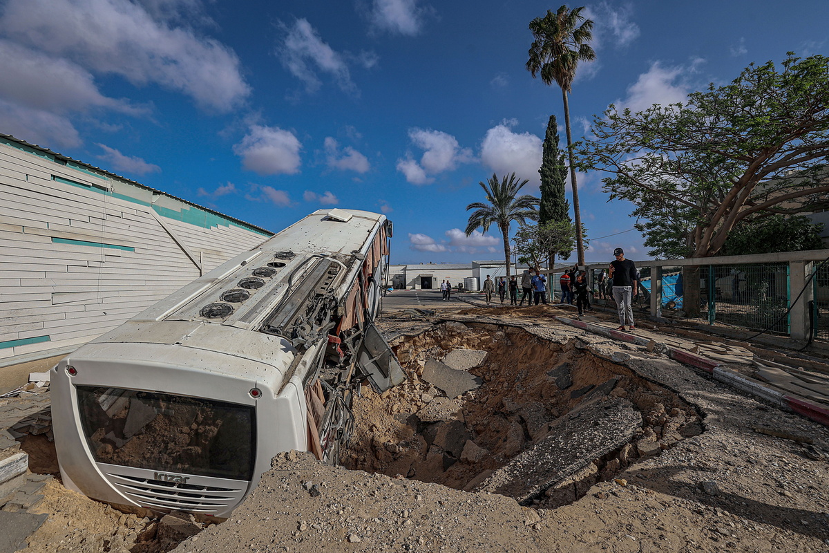 epa12099158 Palestinians inspect a damaged bus at the site of an Israeli airstrike outside the European Hospital the previous day, in the east of Khan Younis, southern Gaza Strip, 14 May 2025. According to the Civil Defense in Gaza, at least 11 Palestinians were killed. More than 52,900 Palestinians have been killed in the Gaza Strip, according to the Palestinian Ministry of Health, since Israel launched a military campaign in the strip in response to a cross-border attack led by the Palestinian militant group Hamas on 07 October 2023, in which about 1,200 Israelis were killed and more than 250 taken hostage. EPA/MOHAMMED SABER