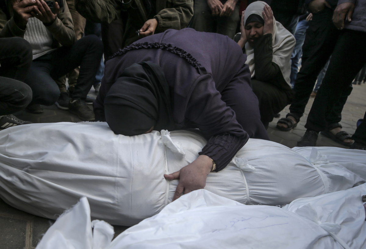 epa11825824 Palestinian women mourn over the covered bodies of the members of a Palestinian family killed in an Israeli airstrike, at Al Aqsa Martyrs Hospital in Deir Al Balah town, central Gaza Strip, 15 January 2025. According to the Palestinian Ministry of Health in Gaza, at least 11 Palestinians were killed following an overnight Israeli airstrike in Deir Al Balah, central Gaza. More than 46,500 Palestinians and over 1,400 Israelis have been killed, according to the Palestinian Health Ministry and the Israeli Army, since Hamas militants launched an attack against Israel from the Gaza Strip on 07 October 2023, and the Israeli operations in Gaza and the West Bank which followed it. EPA/MOHAMMED SABER