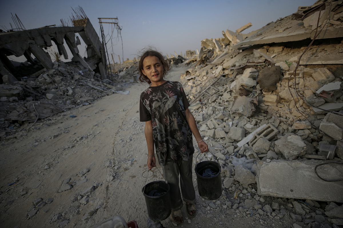 epa12502930 Eleven-year-old Shahed Abu Warda with pails of water at the site of her family's destroyed home in Jabaliya, northern Gaza Strip, 04 November 2025, amid a ceasefire between Israel and Hamas. Following Israeli claims that Hamas violated the ceasefire, Prime Minister Netanyahu ordered military strikes on the Gaza Strip on 28 October. In response, Hamas announced it was postponing the planned handover of a recovered hostage's body, citing Israeli truce violations. EPA/MOHAMMED SABER