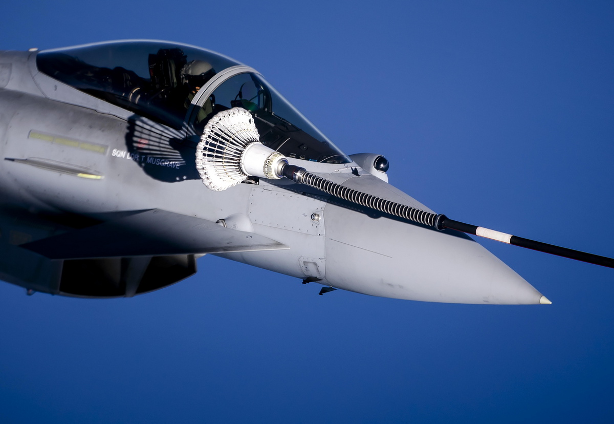 epaselect epa12005572 A British Eurofighter jet is refueled over the North Sea by an MRTT aircraft coming from Eindhoven Air Base, Netherlands, 02 April 2025. The flight is part of the NATO exercise Ramstein. EPA/SEM VAN DER WAL