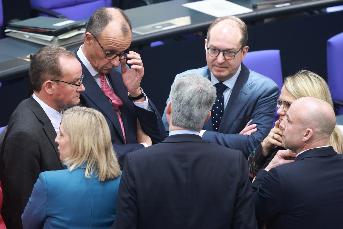 epa11865700 Chairman of the Christian Democratic Union (CDU) party and faction Friedrich Merz (C-L) and Christian Social Union (CSU) regional group chairman in the German parliament Bundestag Alexander Dobrindt (C-R) talk to members of parliament during a session of the German parliament 'Bundestag' in Berlin, Germany, 31 January 2025. The Christian Democratic Union (CDU) is expected to put a draft law to limit the illegal influx of third-country nationals to Germany up for vote. The law might be adopted with votes of the Alternative for Germany party (AfD), which would represent a crack of the CDU's previous stance of maintaining a so-called 'firewall' against collaboration with the far-right party. EPA/CLEMENS BILAN