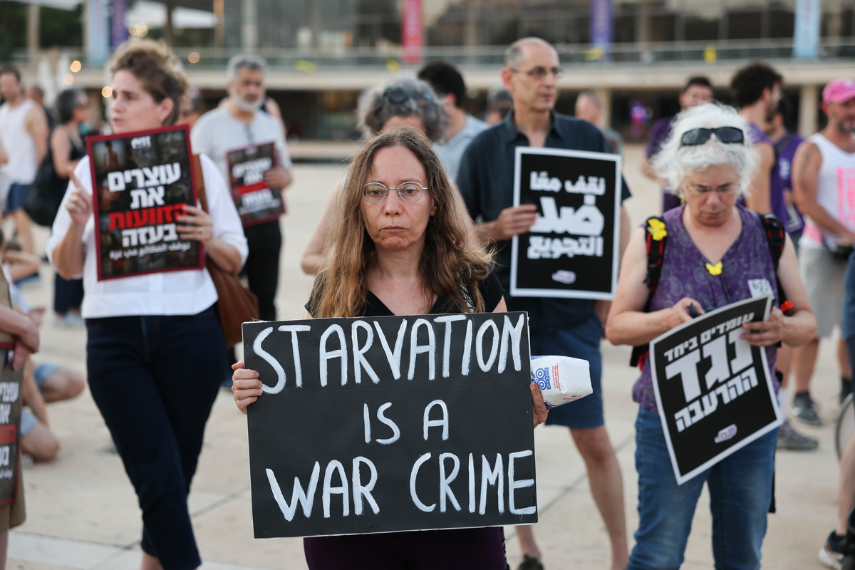 epa12253841 Israeli and Arab activists take part in a rally calling for an end to the war on Gaza and the famine stemming from it, in Tel Aviv, Israel, 22 July 2025. At least 100 Palestinians, including 80 children, have died of malnutrition in the Gaza Strip, the Palestinian Ministry of Health said on 22 July. EPA/ABIR SULTAN