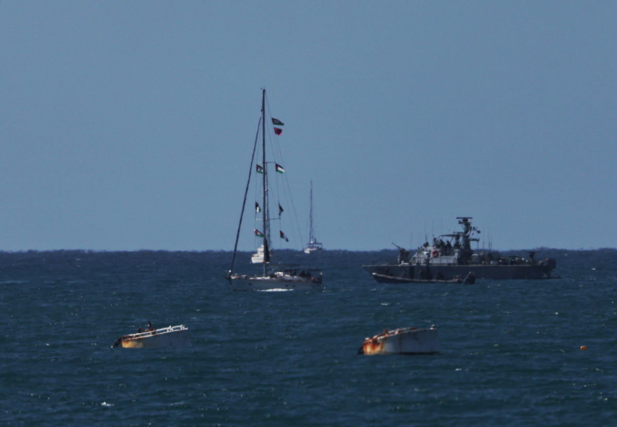 epa12423129 A vessel of the Global Sumud Flotilla arriving at Ashdod port 02 October 2025 after being intercepted whilst carrying aid to Gaza. Israel's Foreign Ministry announced that several vessels that form part of the Global Sumud Flotilla (GSF) had been stopped and that those aboard were being transferred to an Israeli port. EPA/ATEF SAFADI