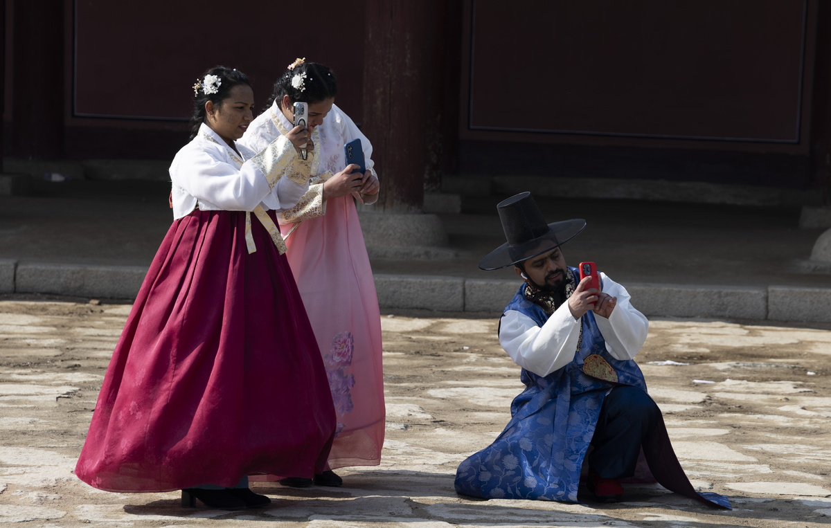 Άτομα που φορούν παραδοσιακές ενδυμασίες Hanbok βγάζουν φωτογραφίες στο παλάτι Gyeongbokgung στη Σεούλ. Το Σεληνιακό Νέο Έτος, που γιορτάζεται από τις 26 έως τις 30 Ιανουαρίου, είναι μια από τις πιο σημαντικές παραδοσιακές γιορτές στην Ν. Κορέα. EPA/JEON HEON-KYUN