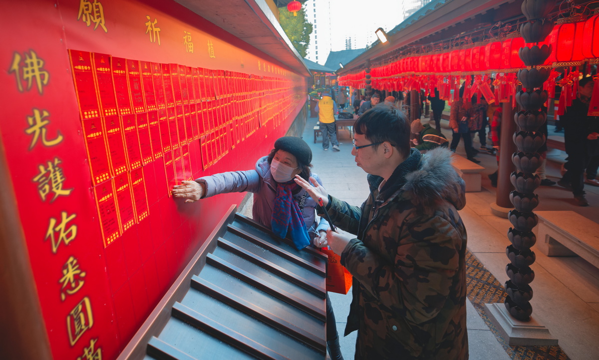 Πολίτες κρεμούν κάρτες με γραπτές προσευχές την πρώτη ημέρα του Κινεζικού Σεληνιακού Νέου Έτους στο Ναό του Βούδα Jade στη Σαγκάη, Κίνα. EPA/ALEX PLAVEVSKI