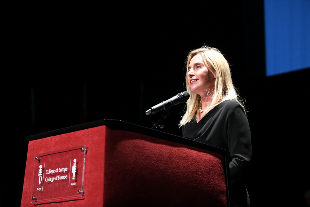 epa08742037 A handout photo made available by the College of Europe shows Rector of the College of Europe, Former High Representatives Federica Mogherini speaks at the ceremony of the official opening of Mario Soares Promotion, 2020-21 academic year, at the College of Europe, in Brugge, Belgium, 13 October 2020. EPA/STEPHANIE PARMENTIER / COLLEGE OF EUROPE HANDOUT HANDOUT EDITORIAL USE ONLY/NO SALES