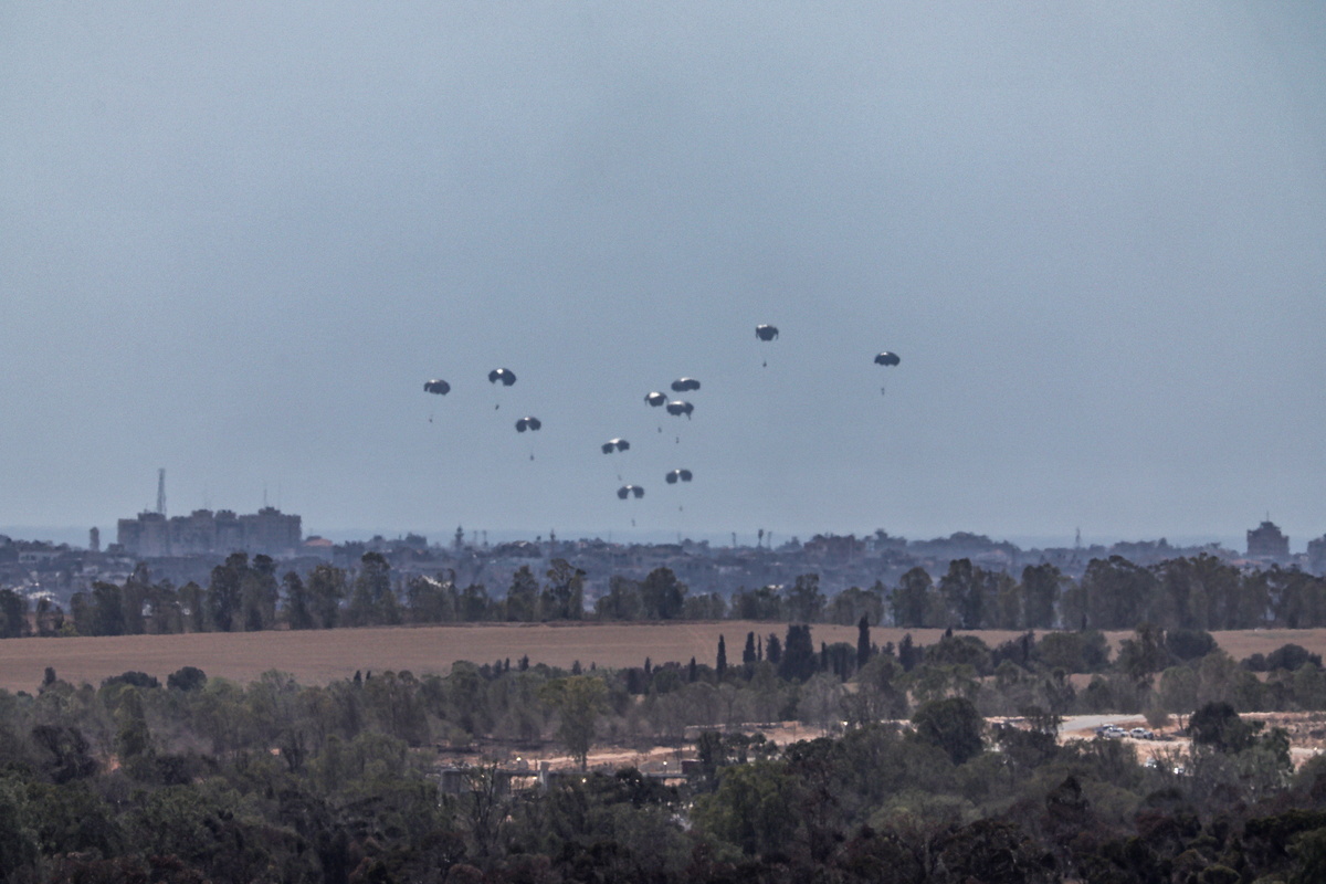 epa12275631 Humanitarian aid is airdropped by UAE air forces over the central Gaza Strip, as seen from southern Israel, 31 July 2025. EPA/ATEF SAFADI