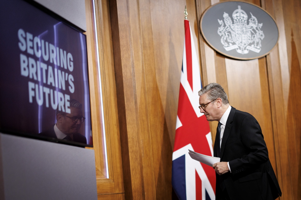 epa12093296 British Prime Minister Keir Starmer leaves after addressing the media in Downing Street, London, Britain, 12 May 2025. The prime minister's speech announced some of the proposals contained in the Government’s Immigration White Paper. EPA/TOLGA AKMEN/POOL
