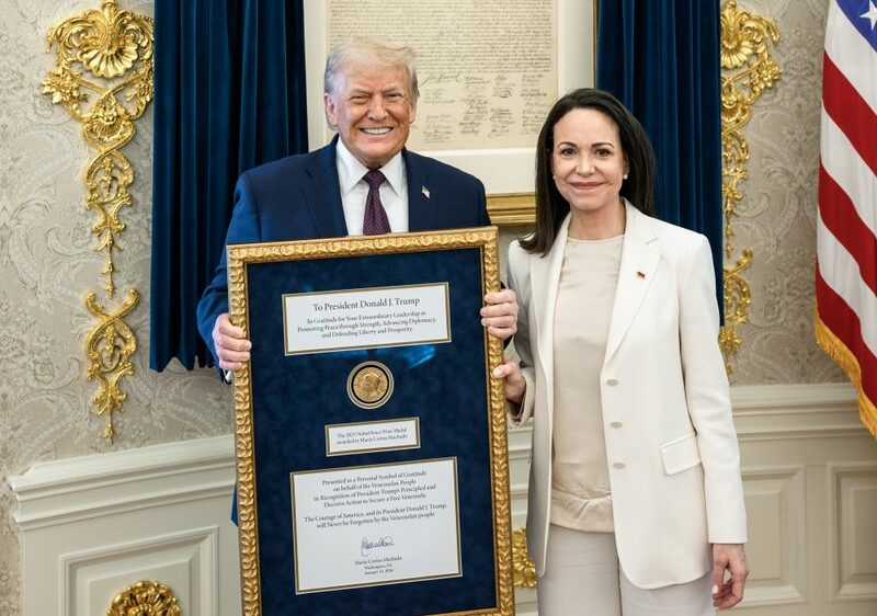Το Νόμπελ Ειρήνης αποτελούσε διακαή πόθο του Ντόναλντ Τραμπ και η Ματσάδο του το αφιέρωσε όταν της απονεμήθηκε πέρυσι. Ωστόσο η νορβηγική επιτροπή των Νόμπελ κατέστησε σαφές μέσω ανακοίνωσης πως το βραβείο «δεν μπορεί να ανακληθεί, να μοιραστεί ή να μεταβιβαστεί σε άλλους».