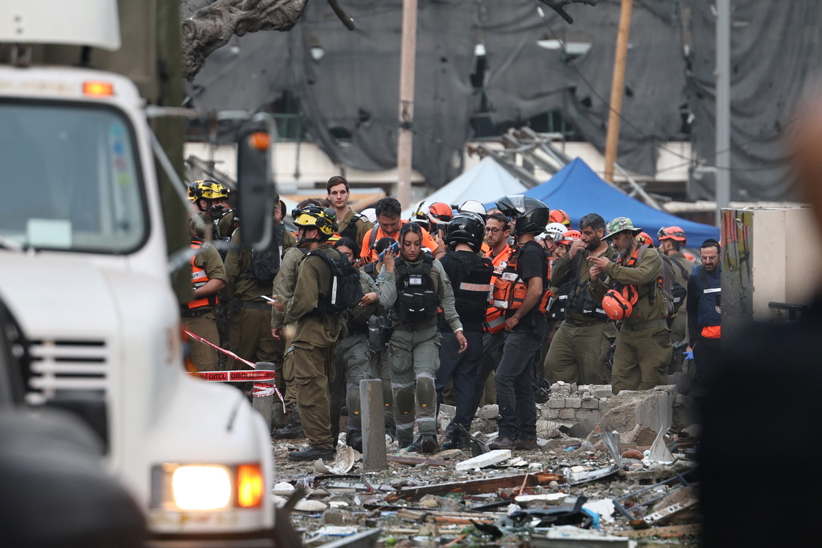 epa12178319 Israeli rescue teams gather at the scene where Iranian ballistic missiles struck buildings in Tel Aviv, Israel, 16 June 2025. According to emergency service, Magen David Adom (MDA), paramedics have pronounced the death of four people and provided medical care to a total of 81 injured, one in serious condition and five in moderate condition. EPA/ATEF SAFADI