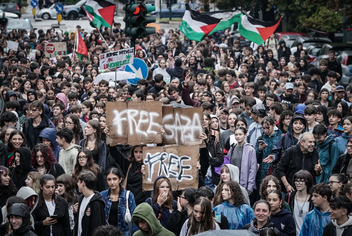 Στην Μπολόνια, στην πορεία των εργαζομένων παίρνουν επίσης μέρος φοιτητές και μαθητές, με πανό τα οποία γράφουν «θα μπλοκάρουμε τα πάντα, ελεύθερη Παλαιστίνη».