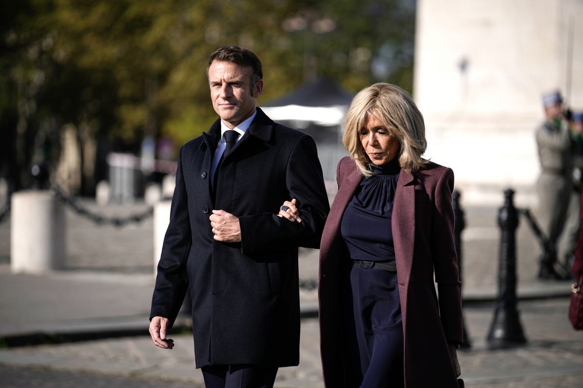 epa11658230 French President Emmanuel Macron (L) and his wife Brigitte Macron leave after a ceremony with Belgium's King Philippe and Queen Mathilde (not pictured) at the Arc de Triomphe, in Paris, France, 14 October 2024. The Belgian royal couple are on a state visit to France from 14 until 16 October. EPA/LOUIS DELMOTTE / POOL MAXPPP OUT