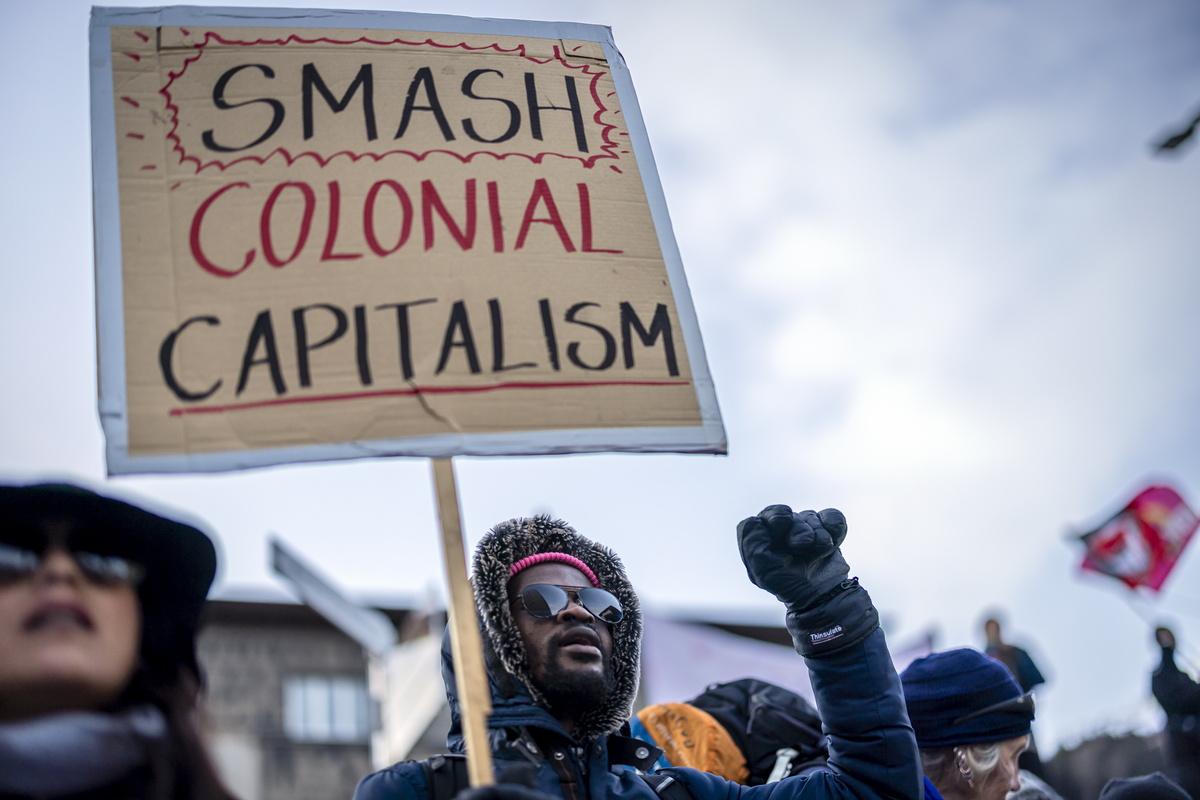 epa11836895 A man holds a placard reading "Smash Colonial Capitalism" as he attends a demonstration before the annual meeting of the World Economic Forum (WEF) in Davos, Switzerland, 19 January 2025. The protest takes the demonstrators on a two-day hike from Kueblis to Davos. The World Economic Forum annual meeting brings together entrepreneurs, scientists, corporate and political leaders in Davos and takes place from January 20 to 24 in Davos. EPA/MICHAEL BUHOLZER