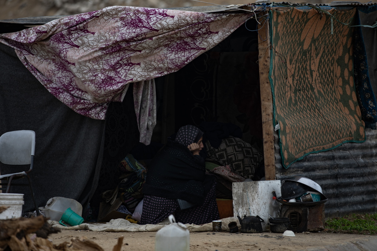 epa11738485 An internally displaced Palestinian woman sits inside her tent on a windy day in Khan Younis, southern Gaza Strip, 24 November 2024. According to the UN, at least 1.9 million people (or nine in ten people) across the Gaza Strip are internally displaced, including people who have been repeatedly displaced. Since October 2023, only about 11 percent of the Gaza Strip has not been placed under Israeli-issued evacuation orders, the UN aid coordination office OCHA said. EPA/HAITHAM IMAD