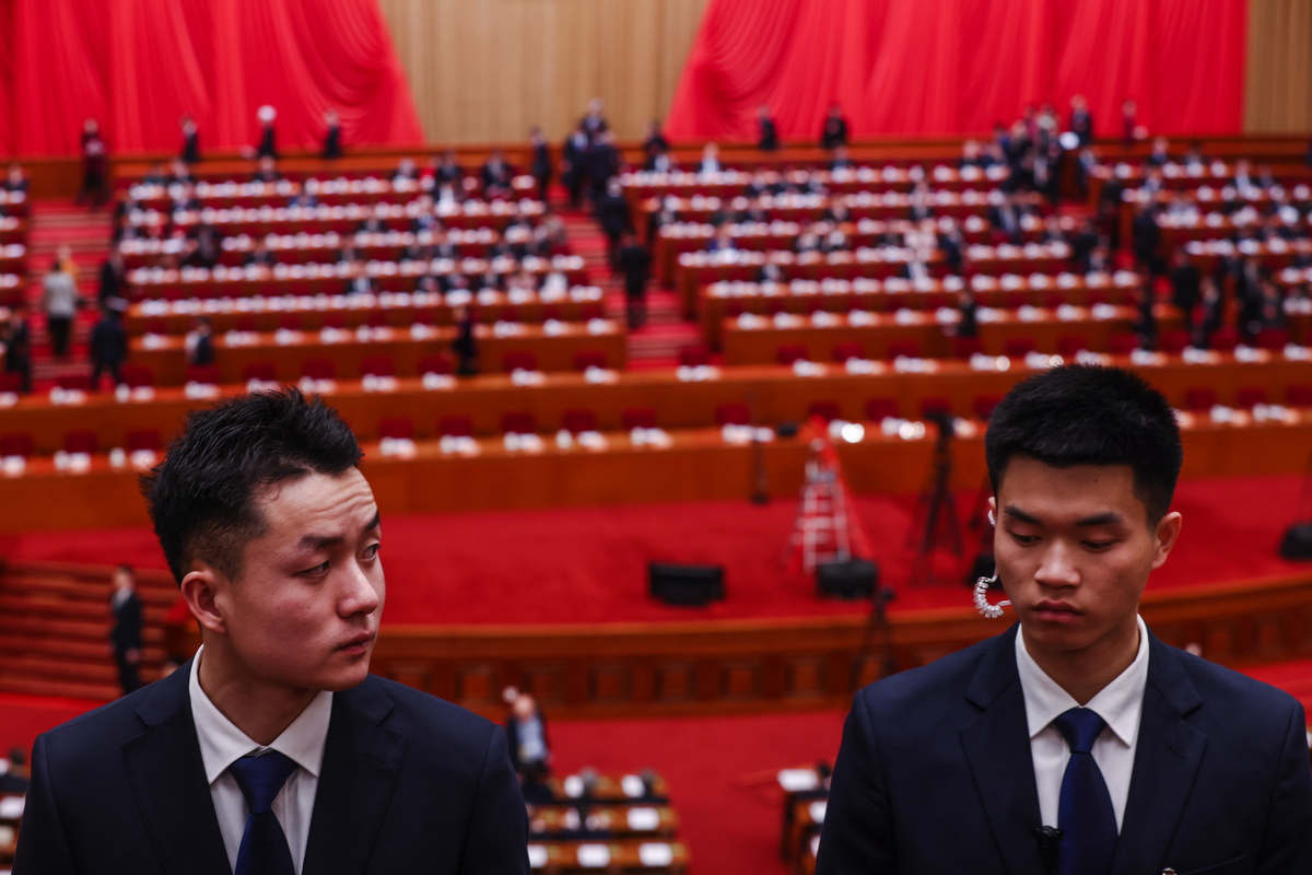 epaselect epa11953035 Security staff members stand guard before the closing meeting of the Third Session of the 14th Chinese People's Political Consultative Conference (CPPCC) National Committee at the Great Hall of the People in Beijing, China, 10 March 2025. China's major annual political meetings, known as the 'Lianghui' or 'Two Sessions,' began on 04 March with the opening of the Chinese People's Political Consultative Conference (CPPCC), while the National People's Congress (NPC) opened on 05 March. EPA/WU HAO